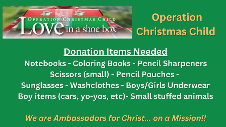 This ministry not only provides a gift to a child, but introduces them to the Gospel of Jesus. In the past few years, our shoeboxes have traveled to Guyana, Benin, Ukraine, South Africa and un-named hard to reach areas. Matthew 28:19 – Make disciples of all the nations. We are Ambassadors for Christ – on a MISSION.