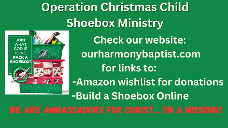 Harmony Baptist Church supports Operation Christmas Child, a project of Samaritan’s Purse. Throughout the year, we collect items to place in shoebox gifts for children in need around the world to share God’s love with them. Some people pack individual boxes and we also pack boxes from the church with donated items. We have created access for those that are unable to shop to pack a shoebox online.